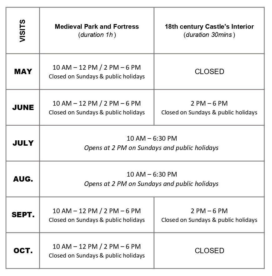Please note also that the last entry will be made either 1h (park) or 1h30 (castle & park) before closure time, in order to allow you to be able to complete the tour.